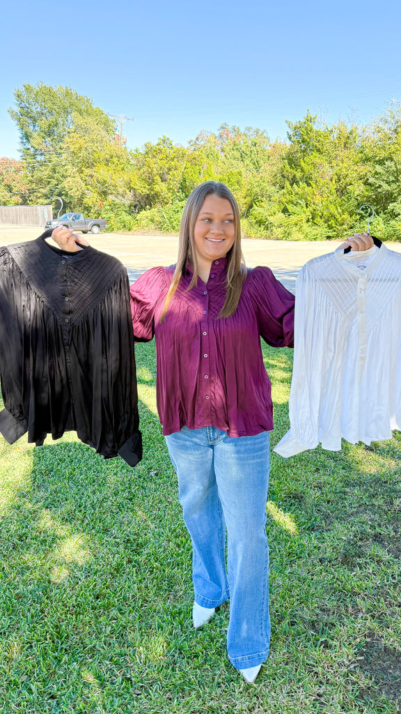 "Take A Hint" V Neck Button Down Long Sleeve Top