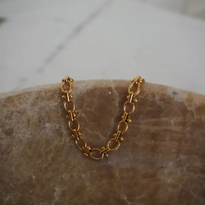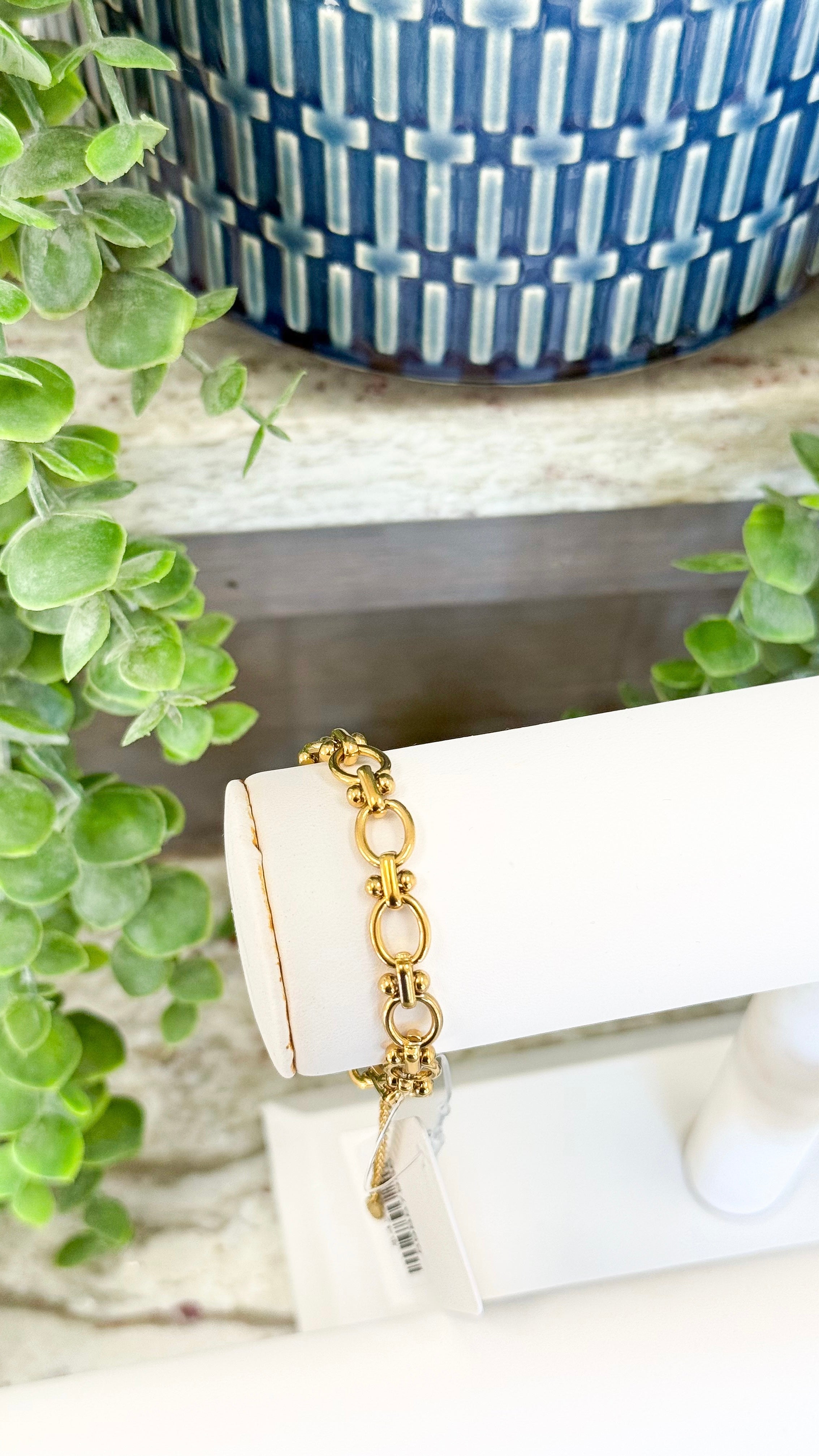 The Blakely Bracelet is a gold, chunky bracelet connected by links. It has three clear stones evenly spaced along the chain. The bracelet also has an extender of 2 inches to the 7 inch bracelet, and is water resistant. It’s elegant and minimal, pairing beautifully with the gold watch and other accessories for a polished, coordinated look.