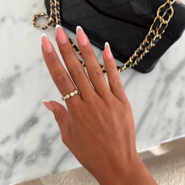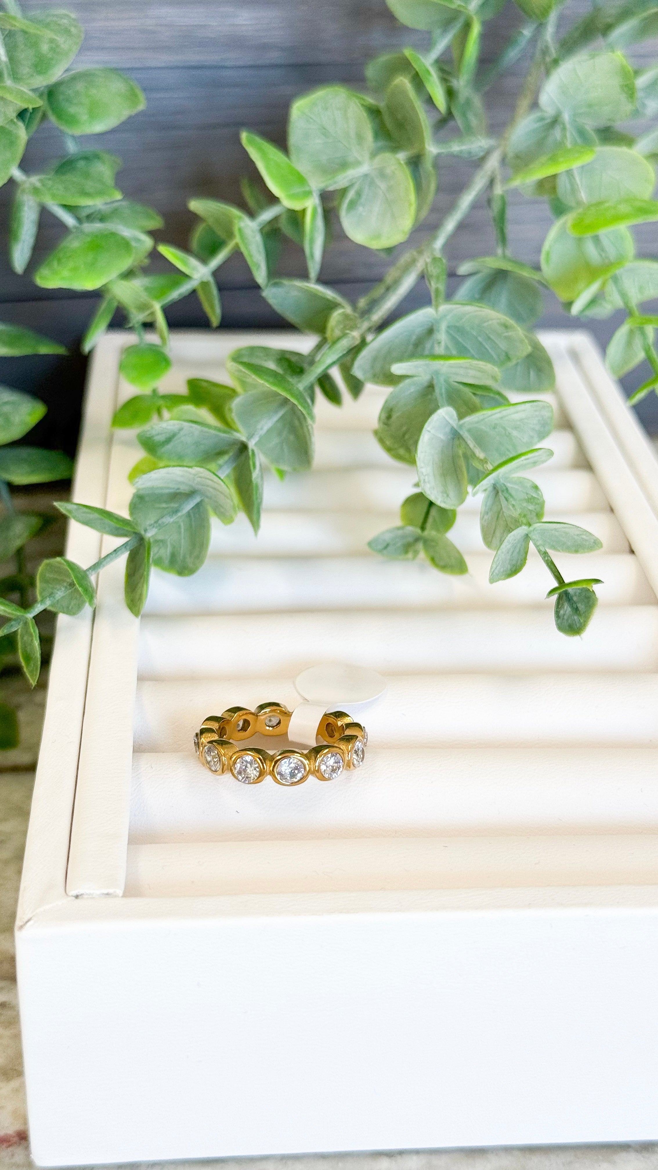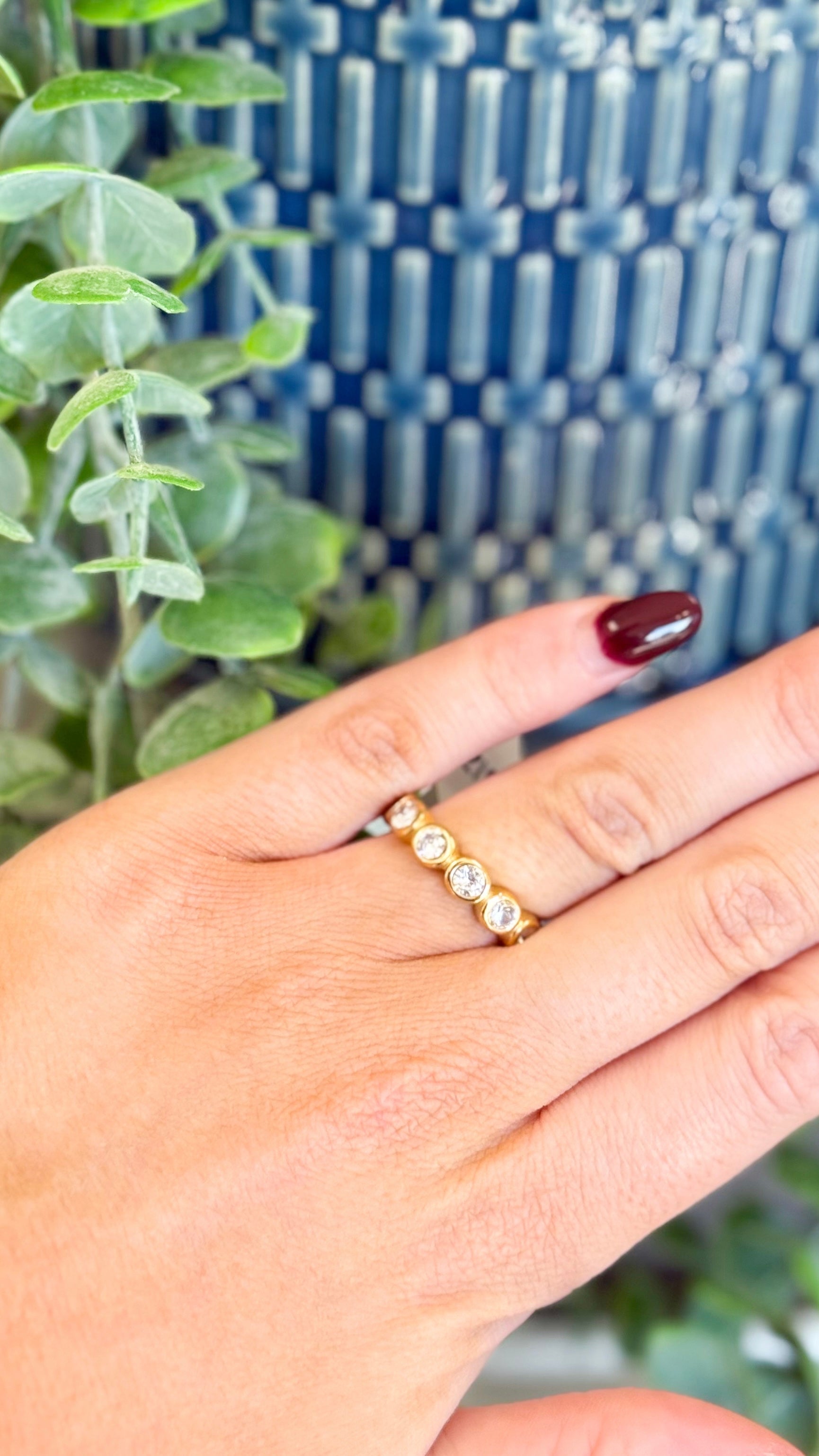 This ring is a gold band with crystal stones arranged in an eternity style with a bezel set.