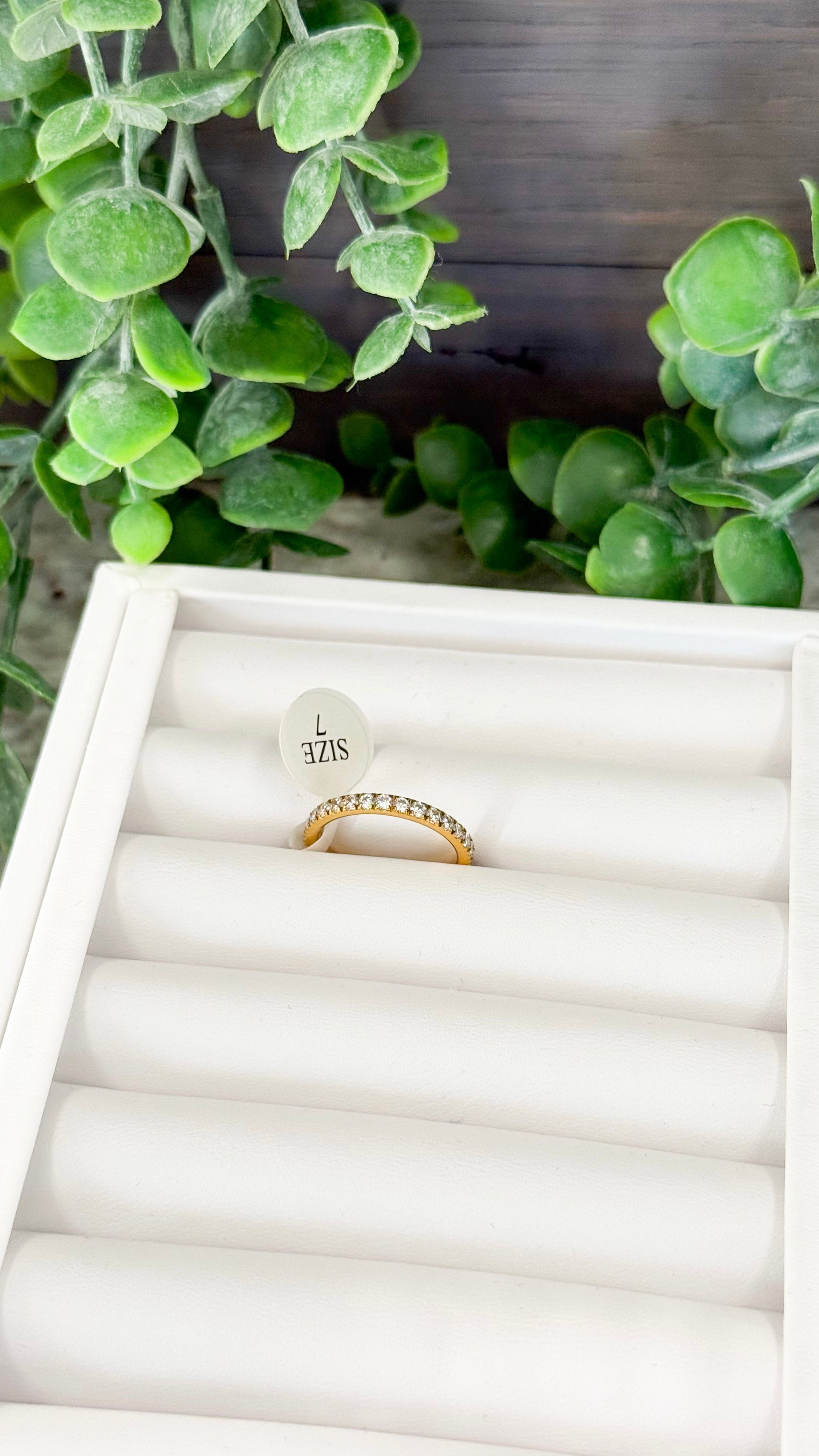 This ring is a gold band with minimalist crystal stones arranged in an eternity style band.