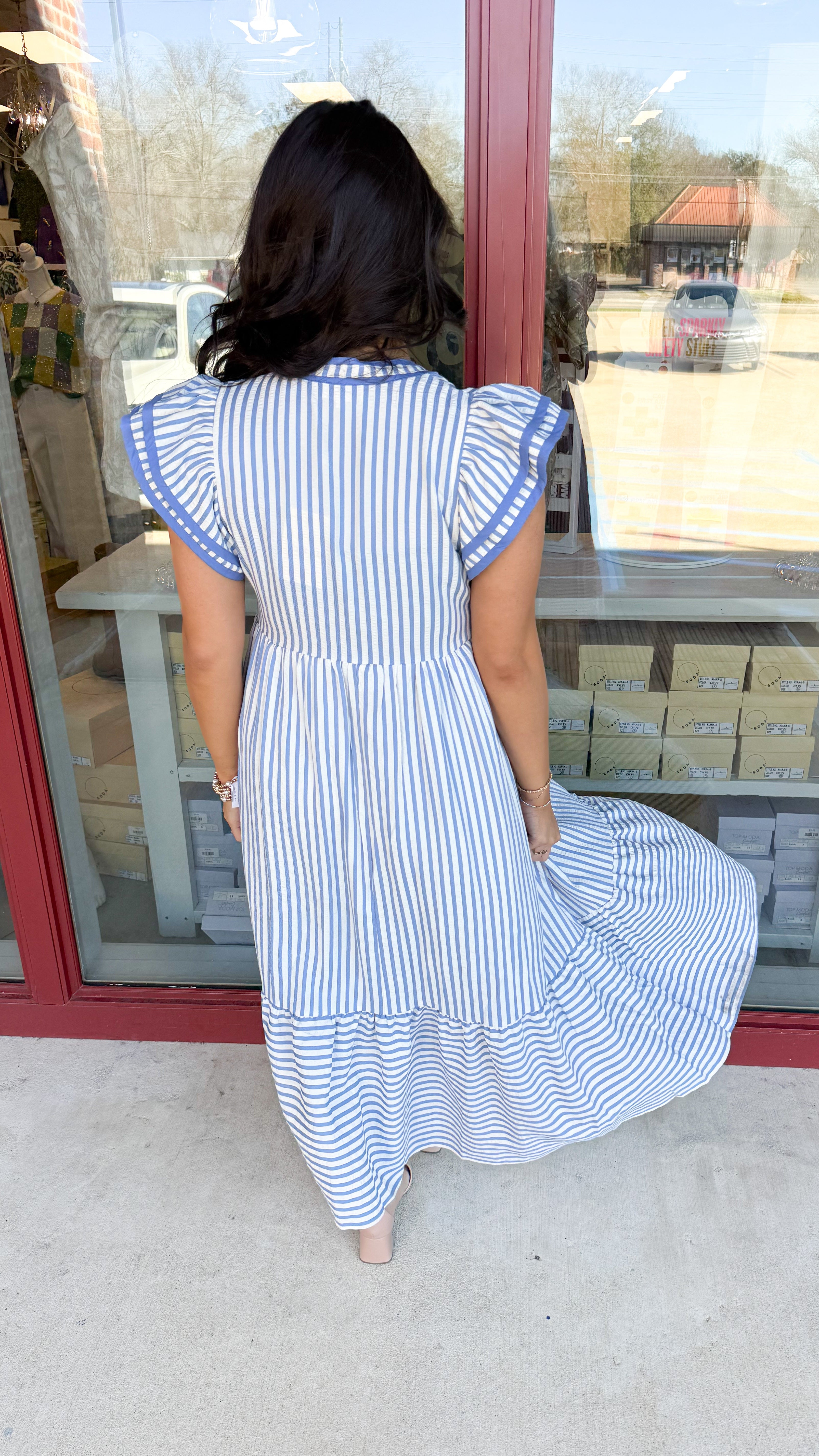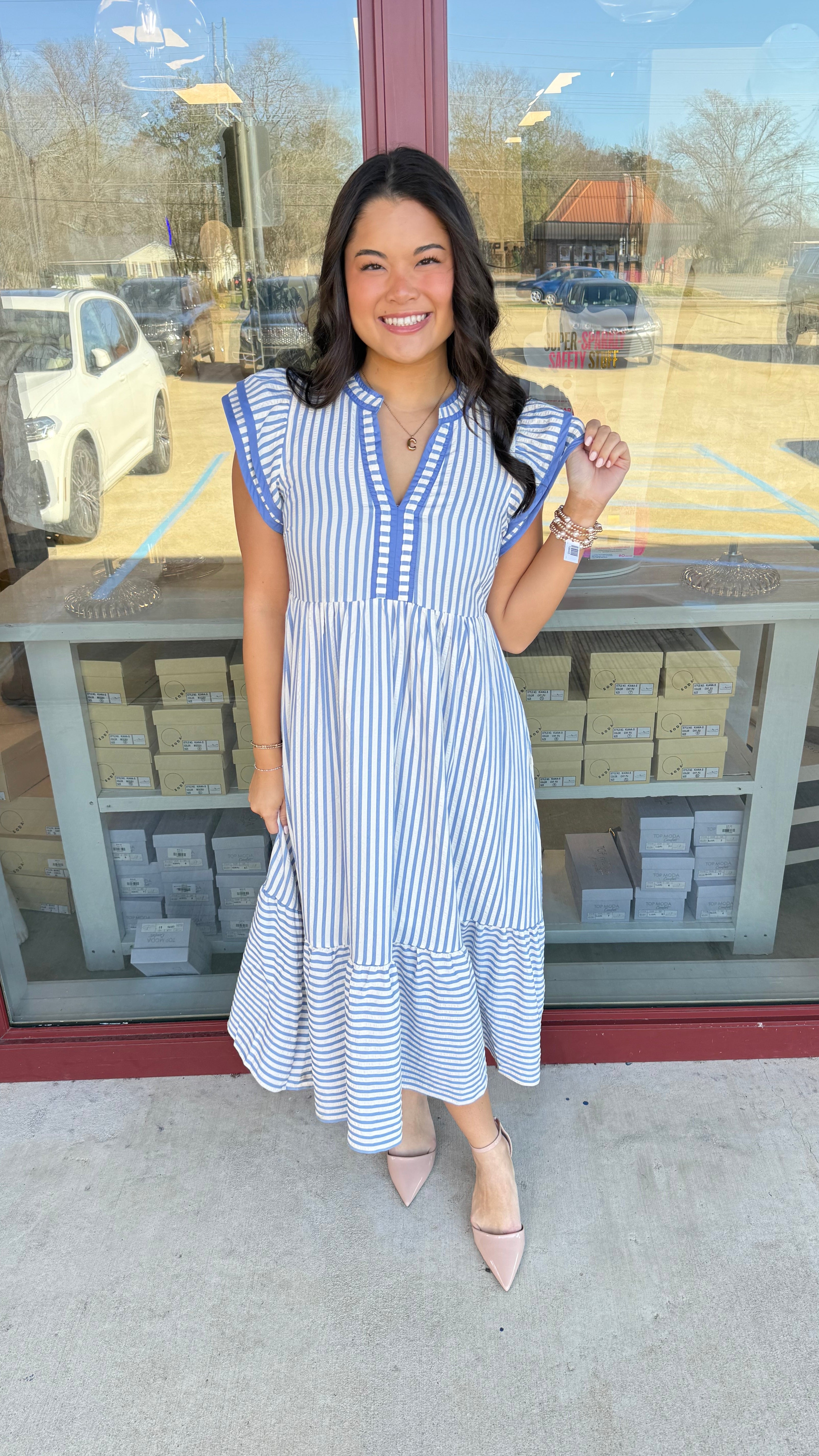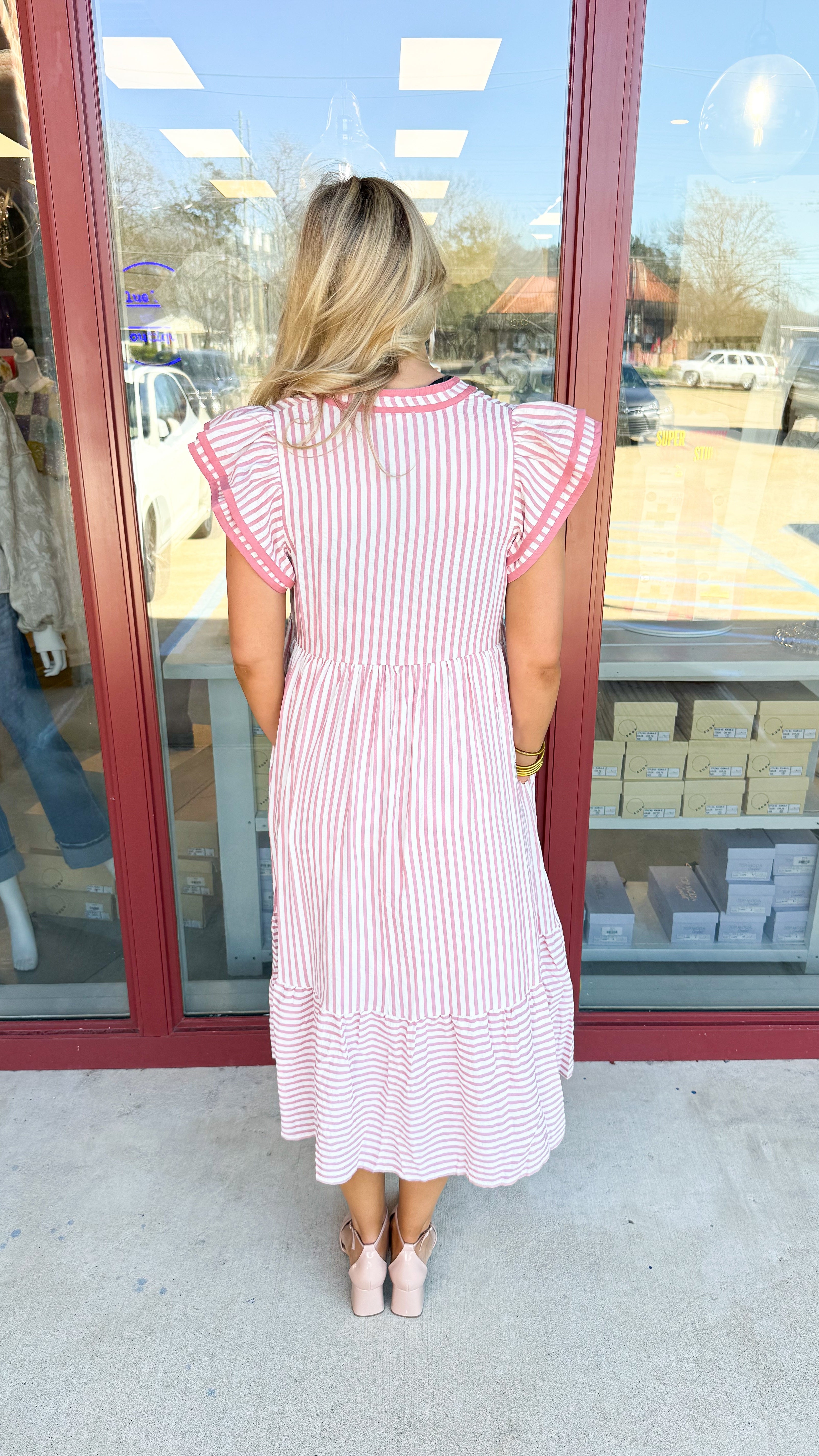 "On The Run" Textured Stripe Flutter Sleeve Dress