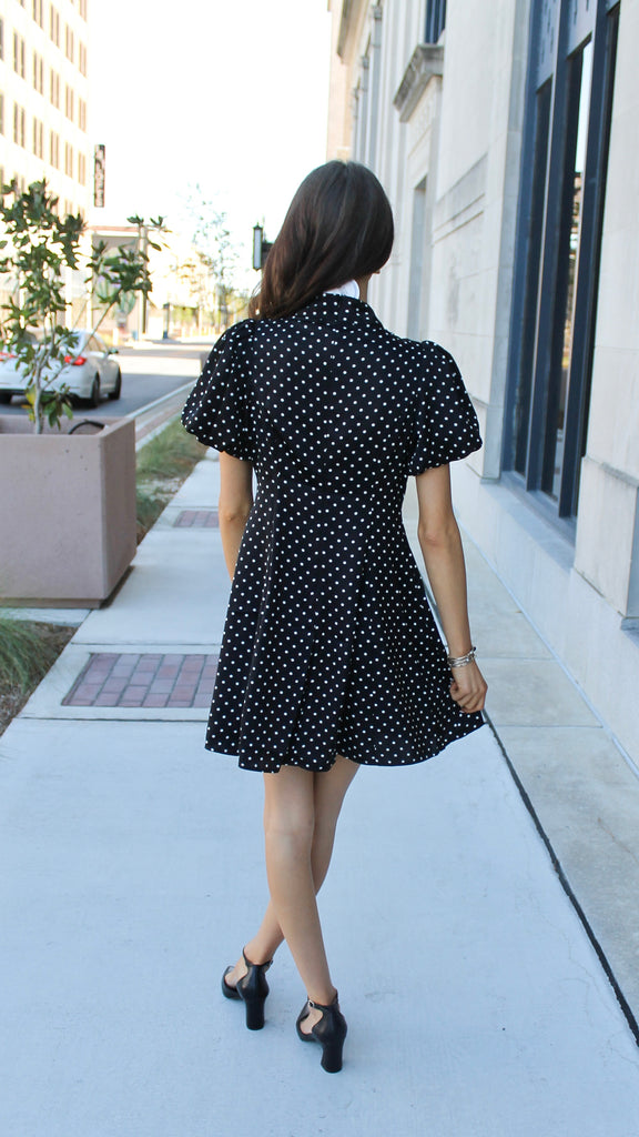 "On The Way" Polka Dot Tie Neck Puff Sleeve Mini Dress