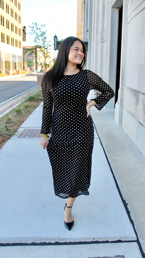 "Over The Way" Polka Dot Mesh Long Sleeve Maxi Dress