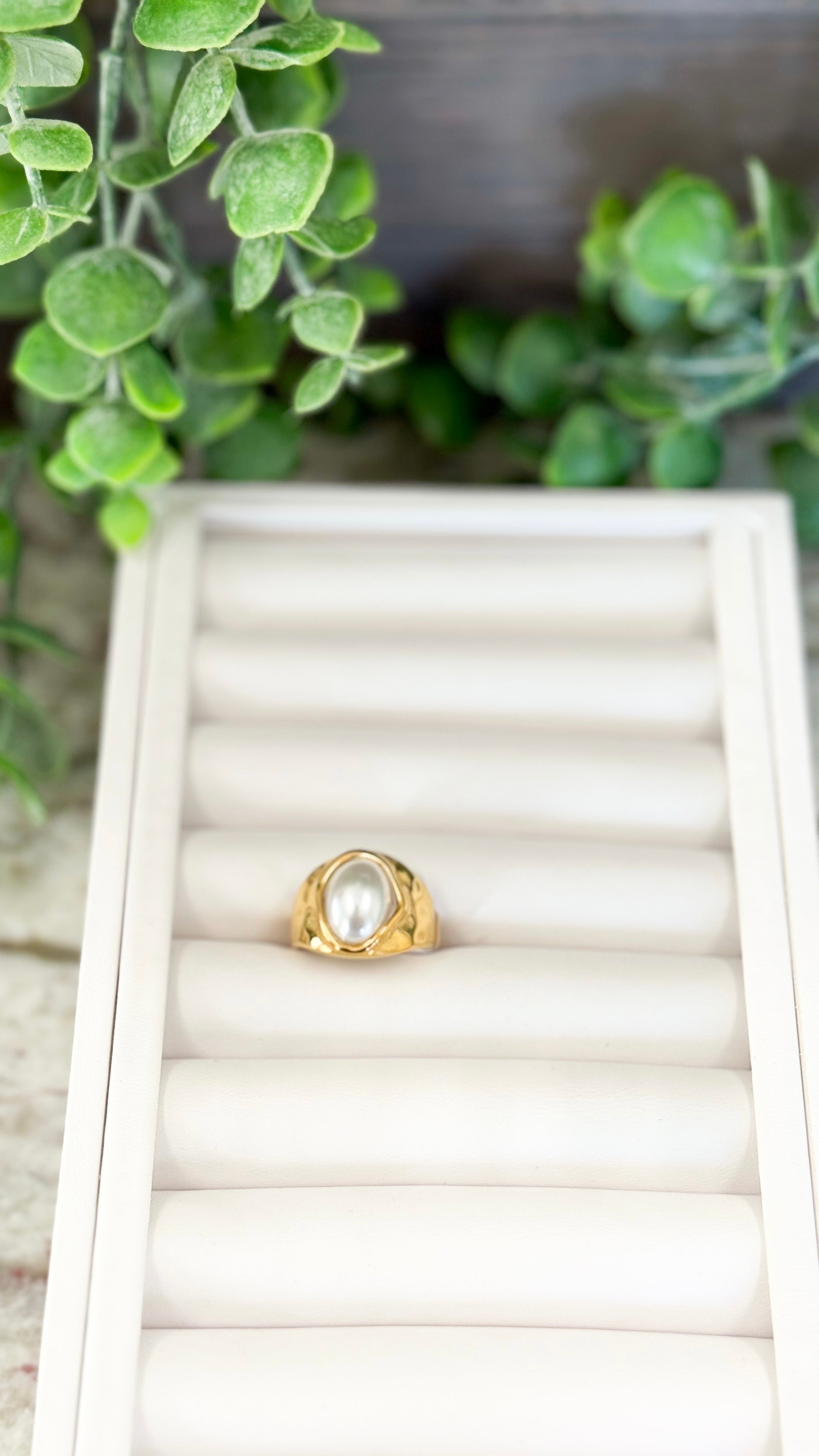 This ring is a gold chunky band, and it has a pearl pendant in the center.