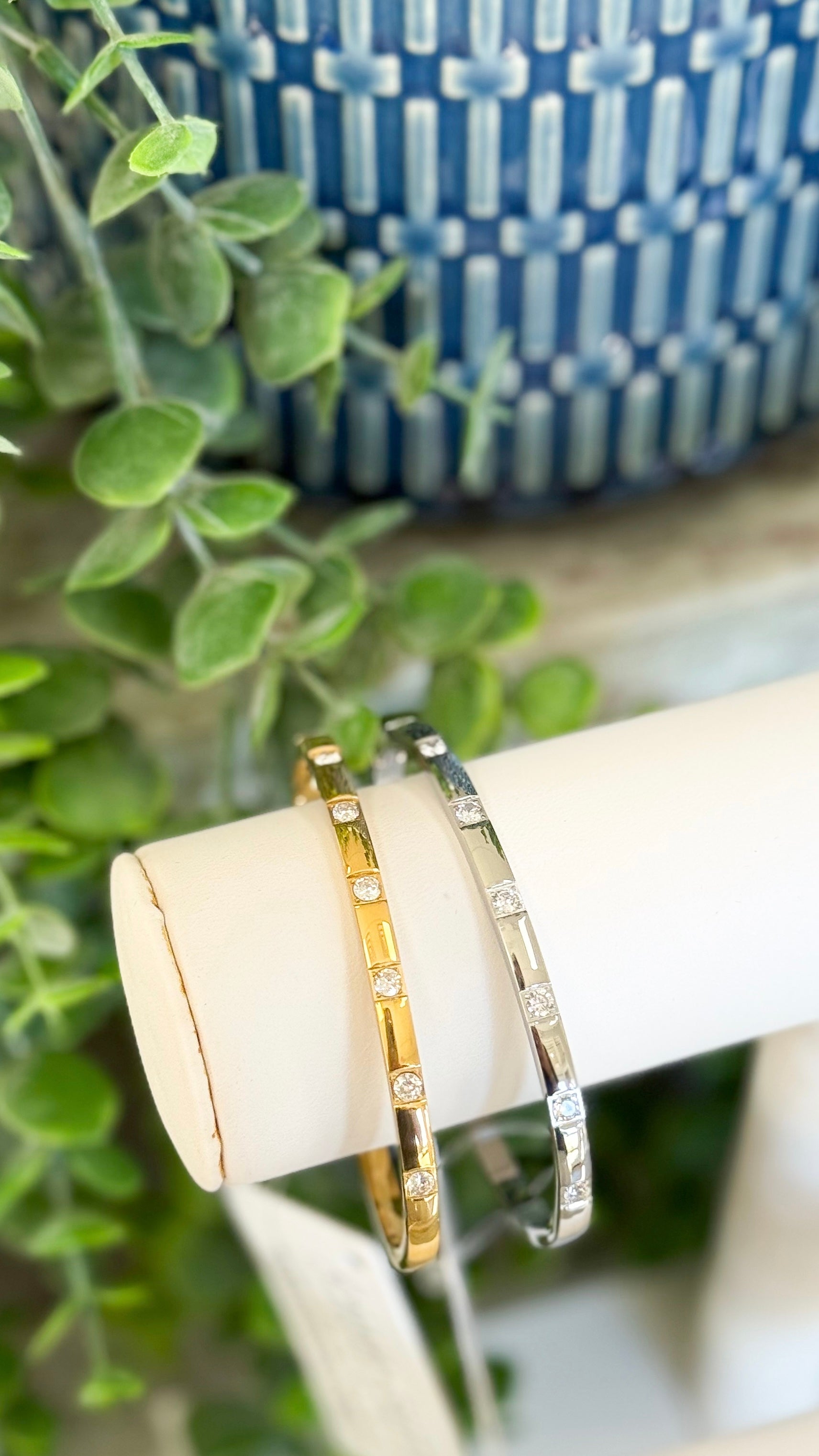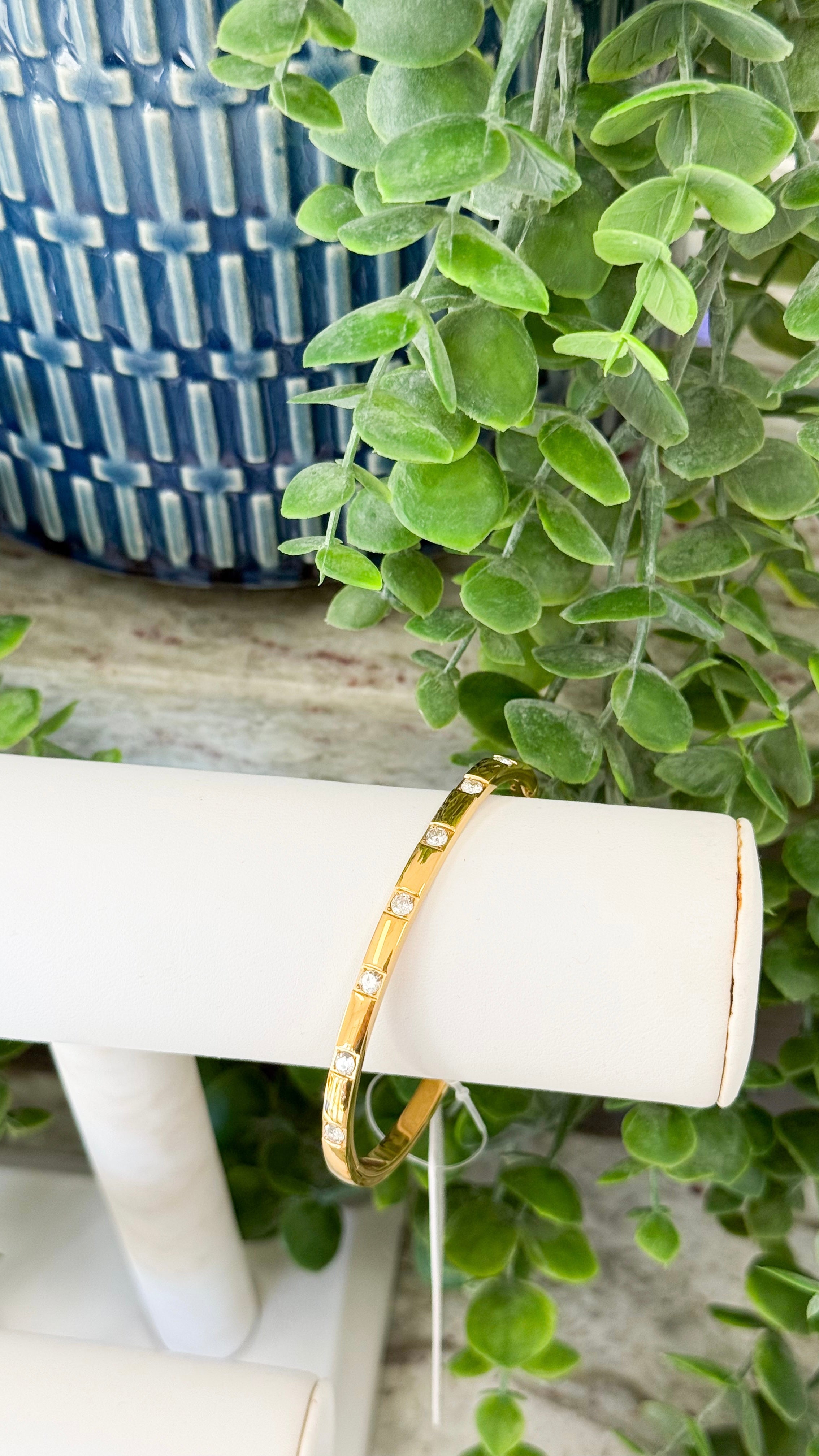 This bracelet is a bangle bracelet, and it features diamonds studs arranged around the bracelet. The bracelet is water resistant. It’s elegant and minimal, pairing beautifully with the gold watch and other accessories for a polished, coordinated look.