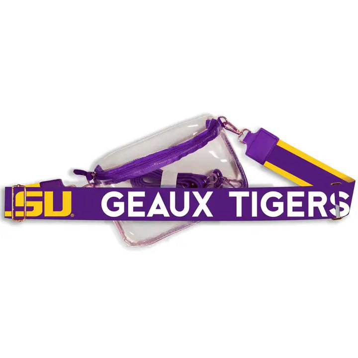 • Clear Vinyl and Soft Vegan Leather with Brass Hardware Accents