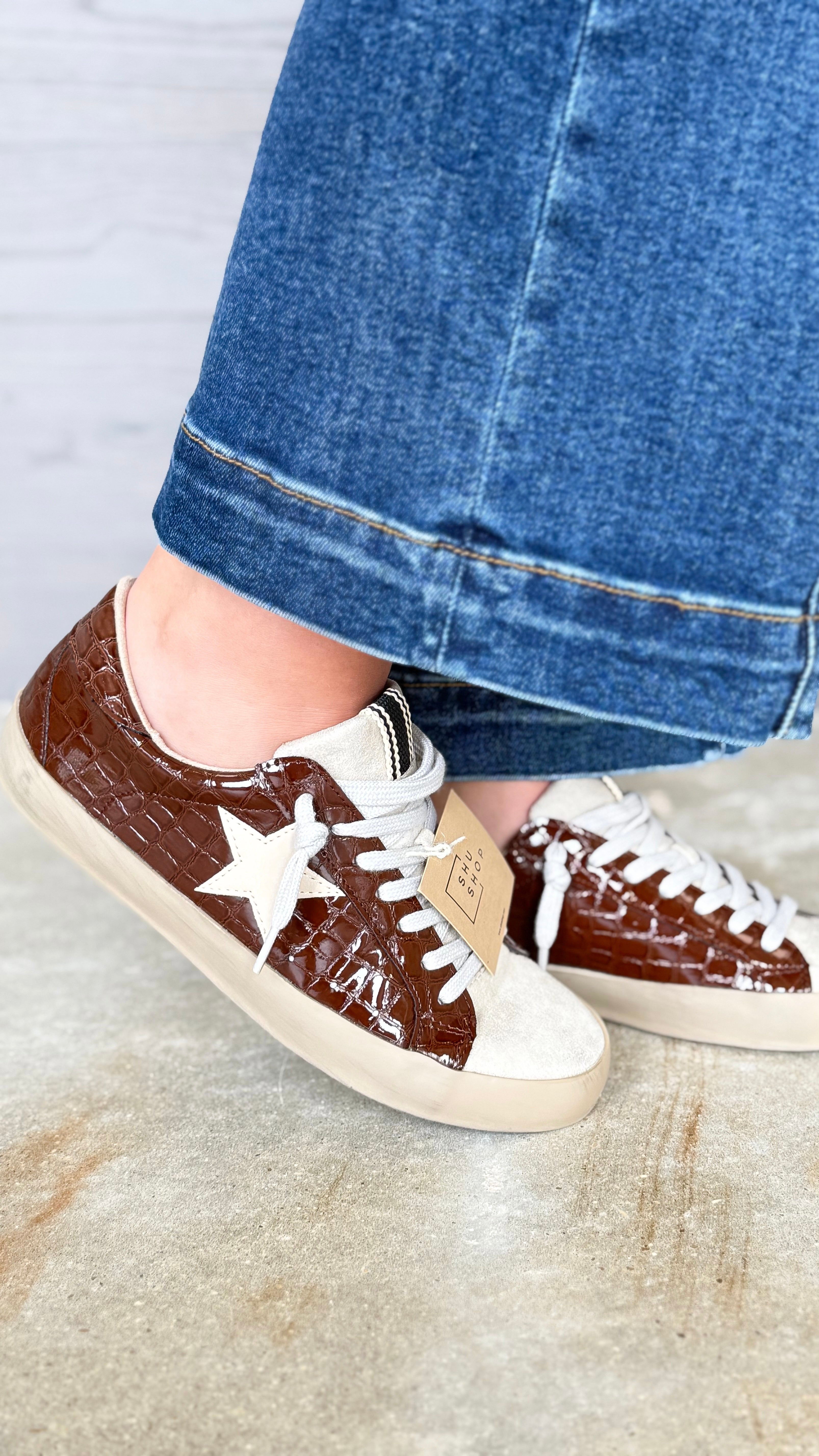 The everyday sneaker, upgraded. PAULA in Brown features a rich, glossy croco texture that's endlessly versatile. This version is all about subtle luxury, easy to wear, yet eye-catching enough to turn heads. Pair it with denim, dresses, or trousers, and it plays well with everything.
