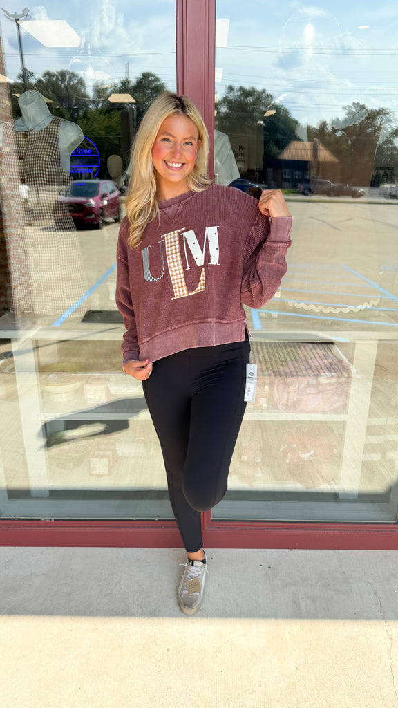 "ULM Patchwork" Cropped Corded Graphic Sweatshirt