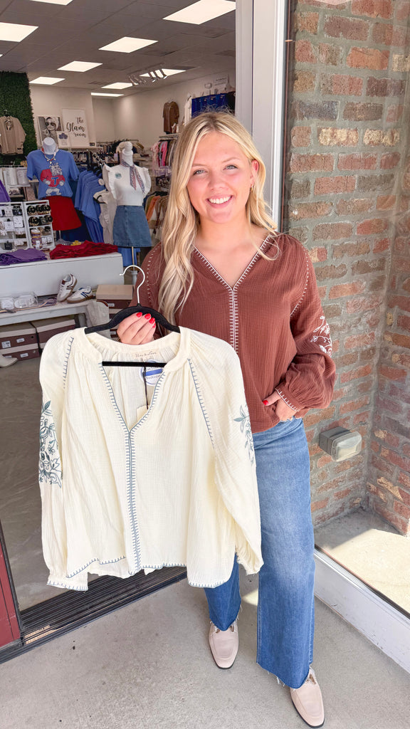 "While You Wait" Floral Embroidered Long Sleeve Top