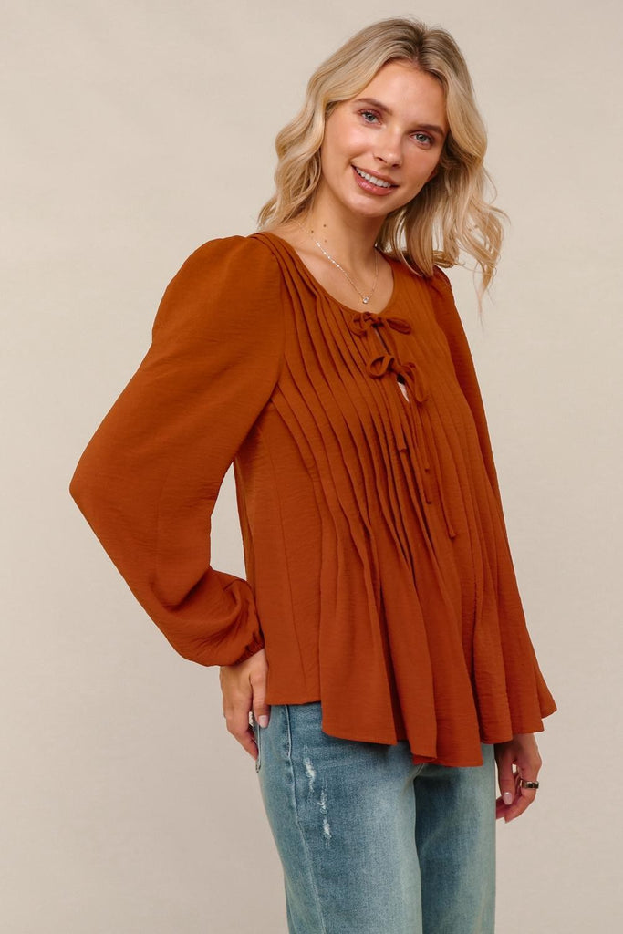 "Catching Vibes" Plus Bow Detail Long Sleeve Blouse Top