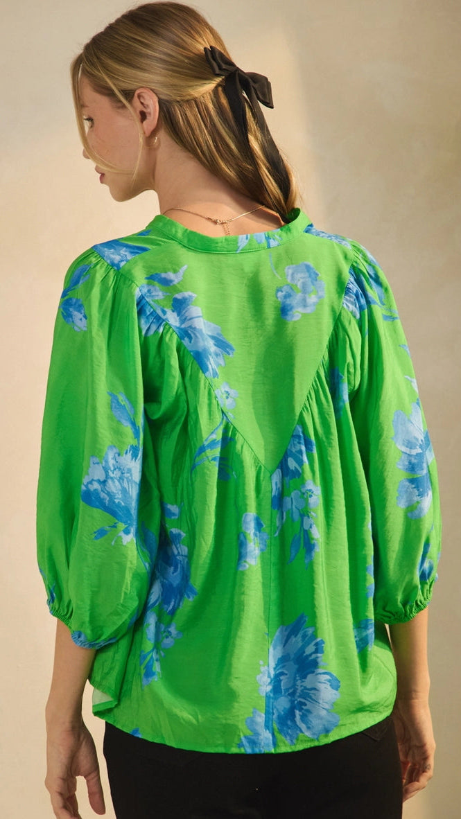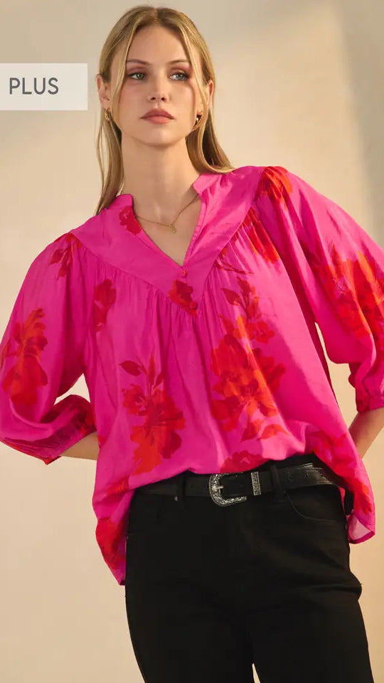 "Lasting Impressions" Plus V Neck Floral Puff Long Sleeve Top