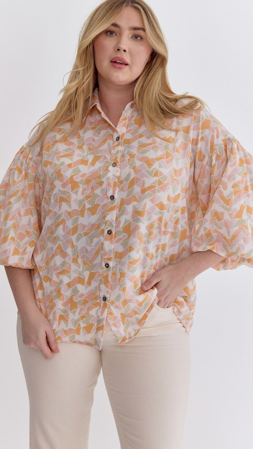 "Nothing Found" Collared Button Up Short Puff Sleeve Top