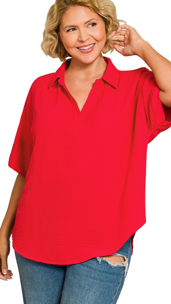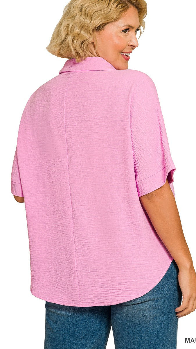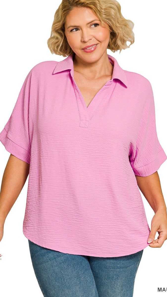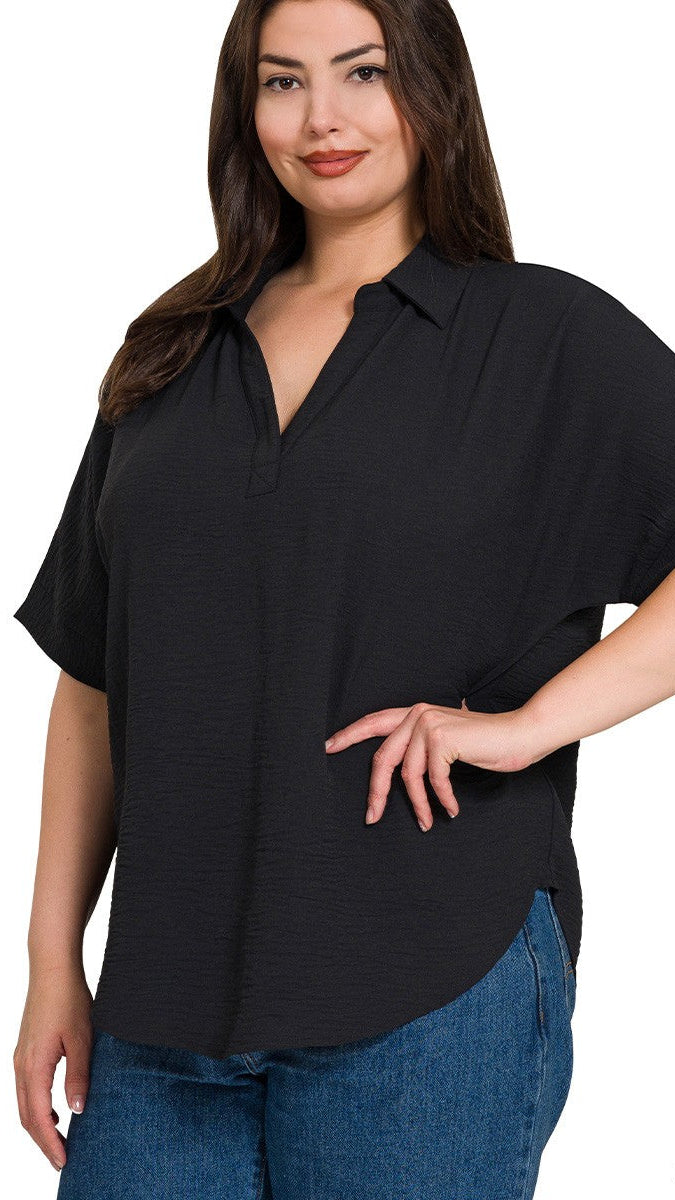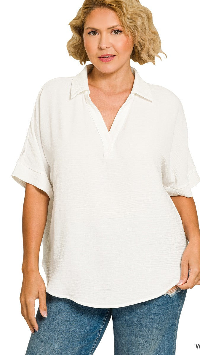 "Pretty Thing" Plus Collared V Neck Woven Short Sleeve Top
