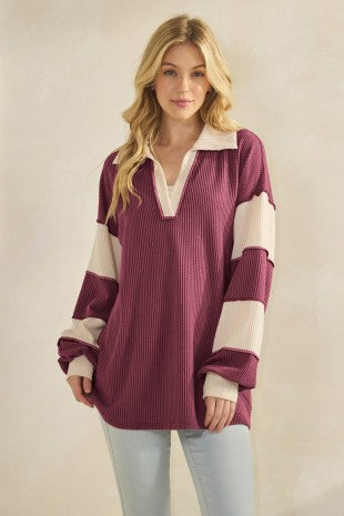 "Made Stronger" Plus Collared Ribbed Contrast Long Sleeve Top